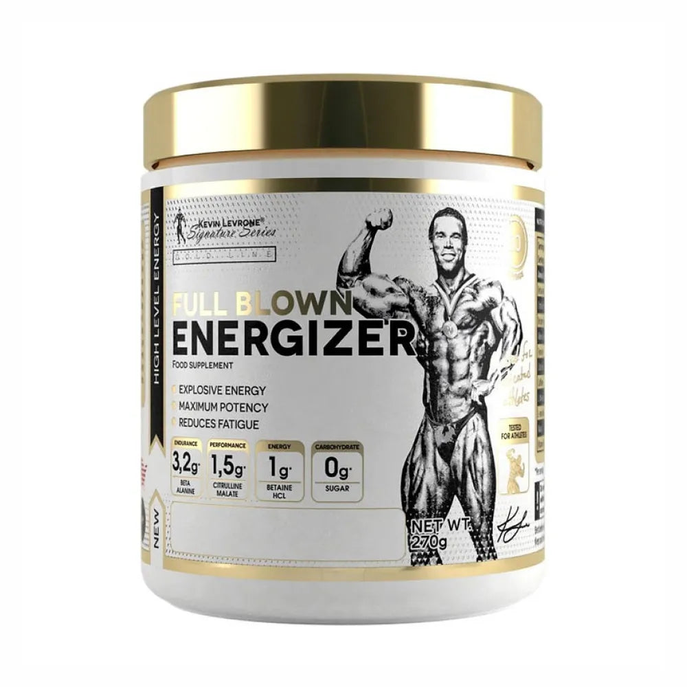 Full Blown Energizer is a food supplement designed to boost energy levels, especially for those engaged in high-intensity and high-volume strength training. It contains caffeine (200 mg per 4.5 g serving) and sweeteners. This product is not recommended for children or pregnant women, but is ideal for physically active adults.