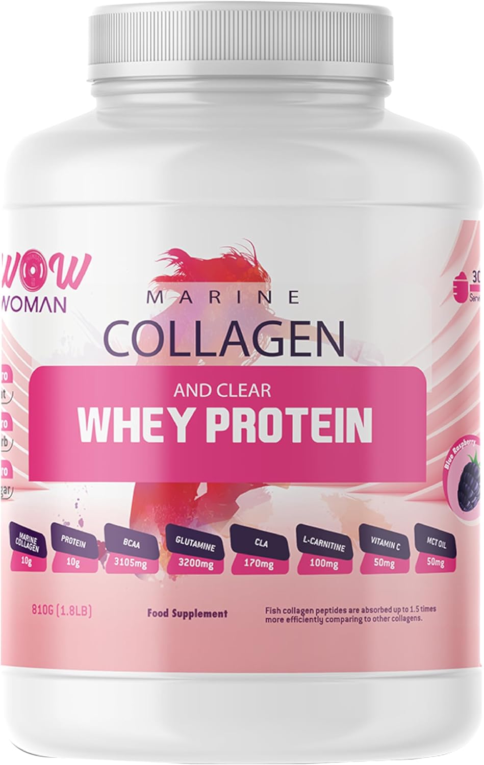 Wow Woman Marine Collagen and Clear Whey Protein combines hydrolyzed marine collagen, whey protein isolate, essential amino acids, and non-essential amino acids with powerful natural fat-burning ingredients to promote overall health and fitness. This blend supports skin health, joint function, muscle preservation, and fat loss, all while providing the body with essential nutrients.